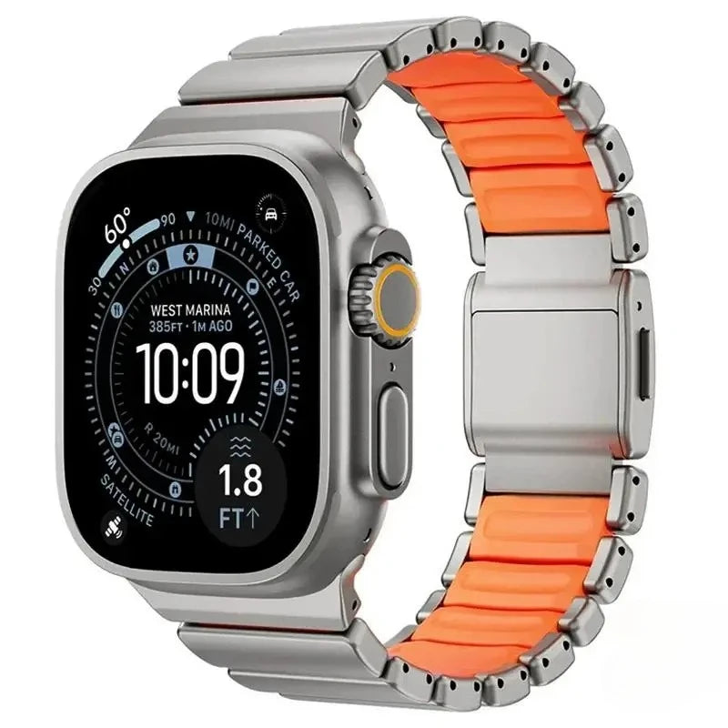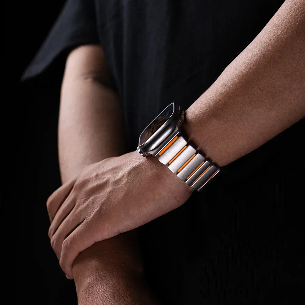 Découvrez le bracelet Argon, un bracelet haut de gamme avec finition style titane et fermeture magnétique. Conçu pour Apple Watch Ultra, il associe confort sportif et allure luxueuse premium.
