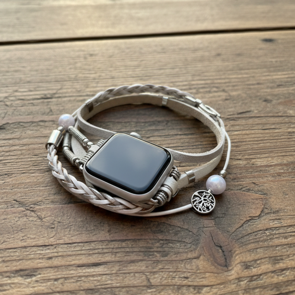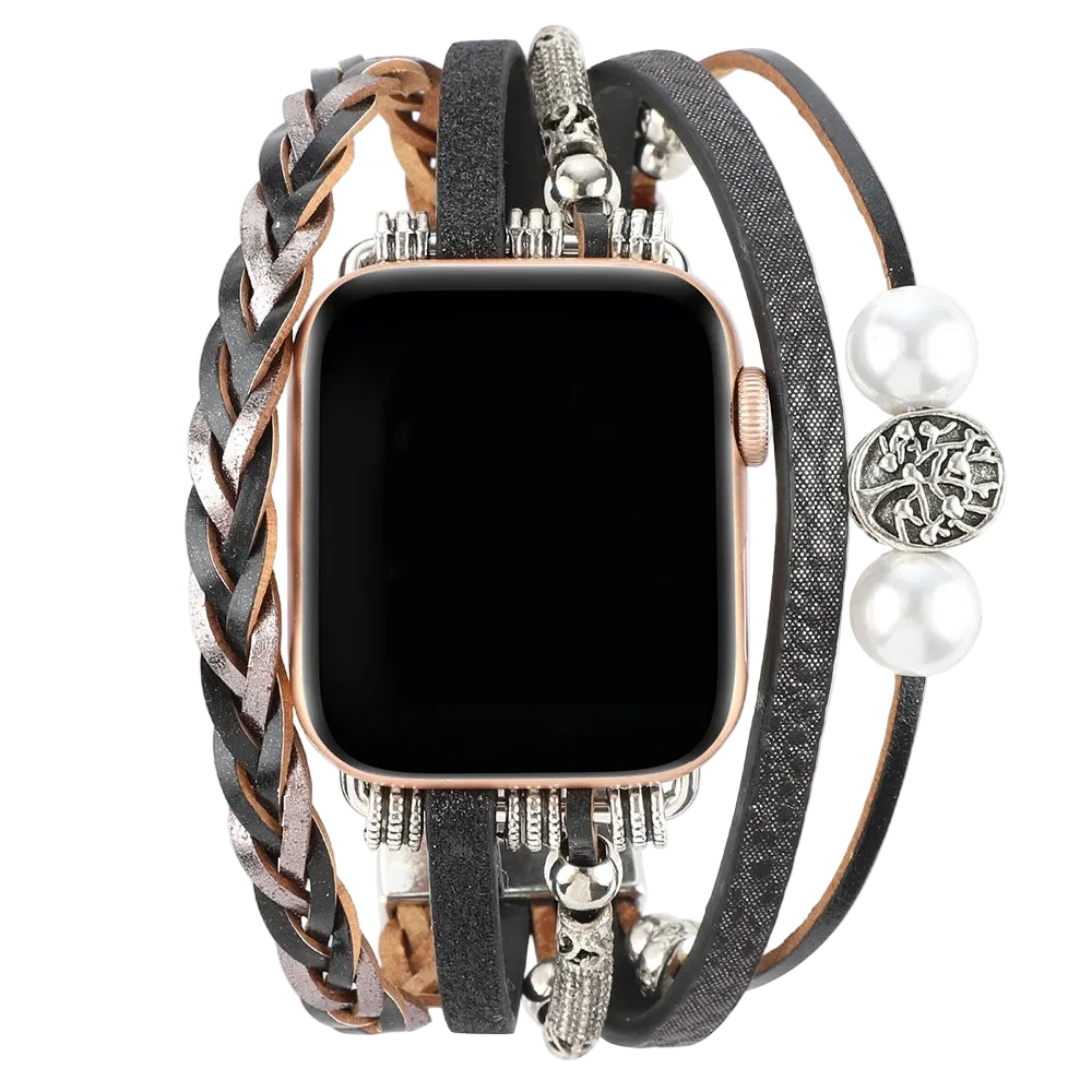 Sublimez votre montre connectée avec le bracelet Élise, un bracelet bijou associant perles décoratives et chaîne tissée pour Apple Watch avec arbre de vie. Son design féminin et raffiné transforme votre iWatch en un véritable accessoire de mode.