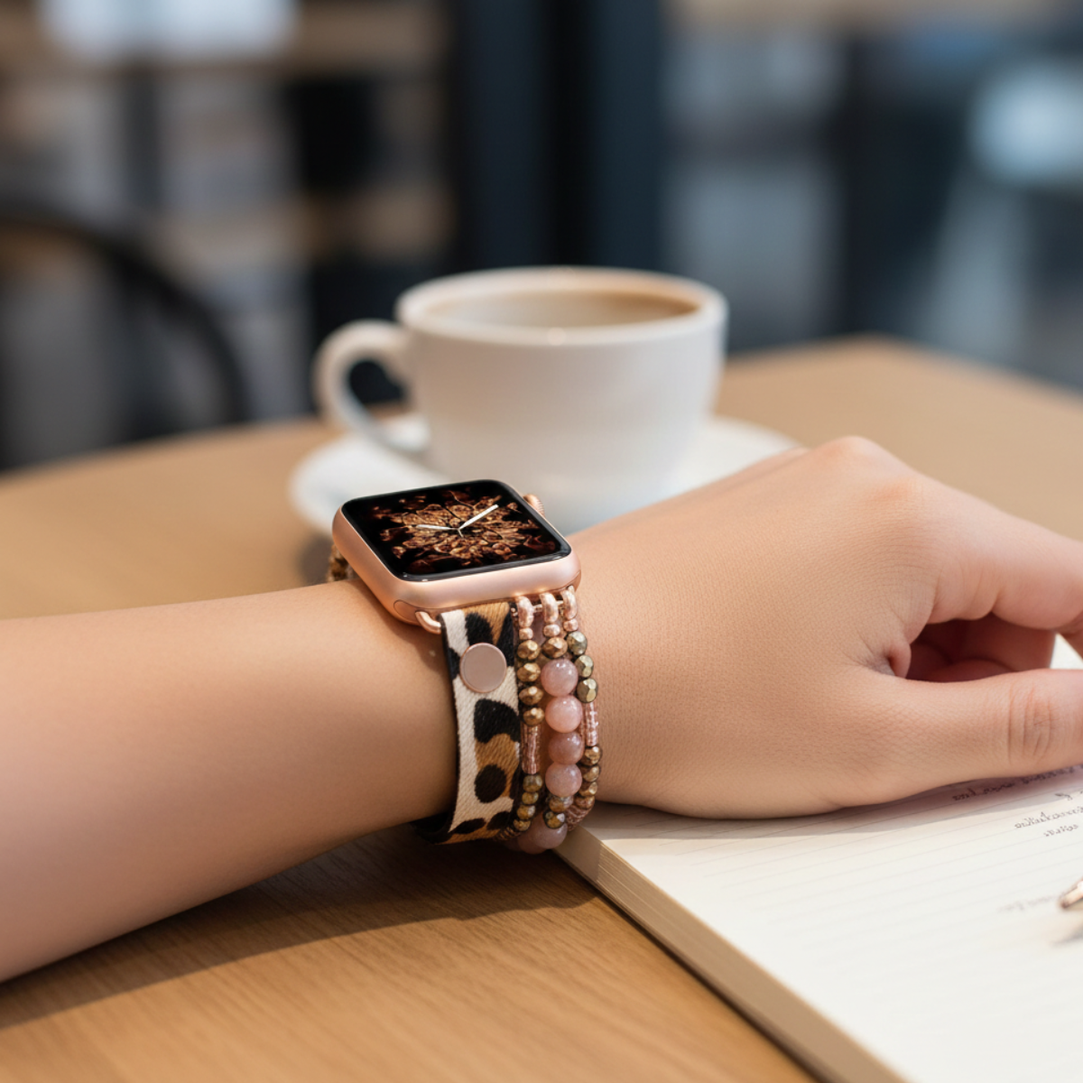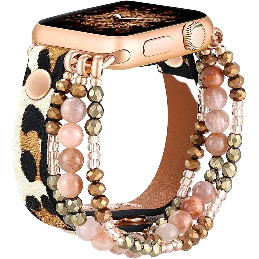 Sublimez votre montre connectée avec le bracelet Iris, un bracelet féminin associant perles décoratives et cuir élastique pour Apple Watch. Son style bijou apporte une touche élégante et originale à votre iWatch.