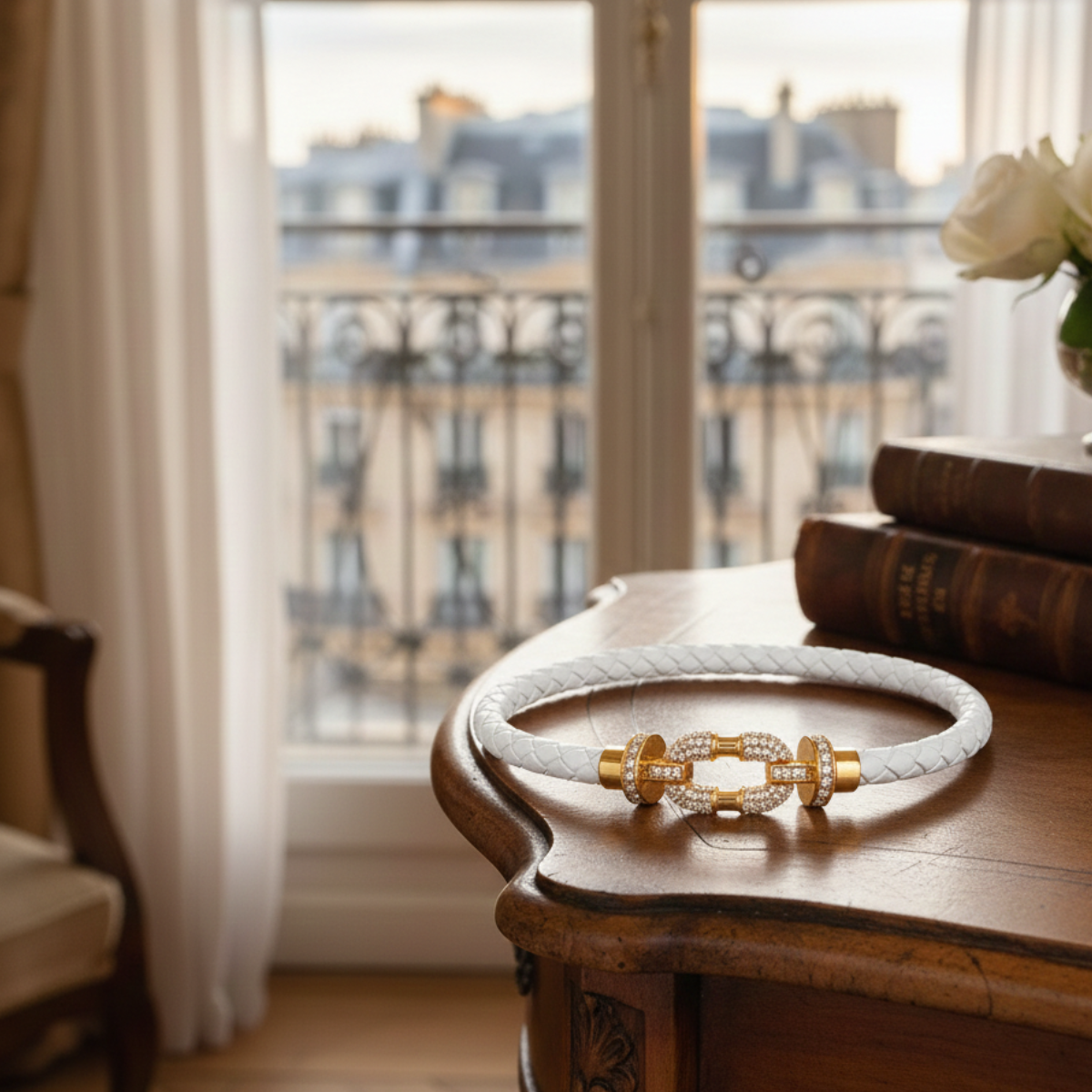 Sublimez votre poignet avec le bracelet Livia, un bracelet en cuir véritable tressé orné d’un médaillon rond en métal serti de zircons cubiques scintillants. Une pièce féminine et moderne qui allie raffinement et caractère.