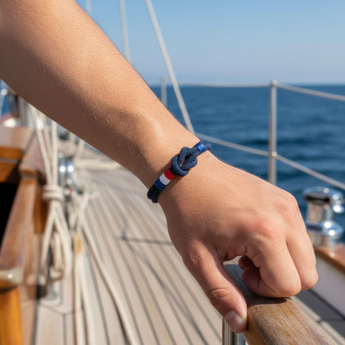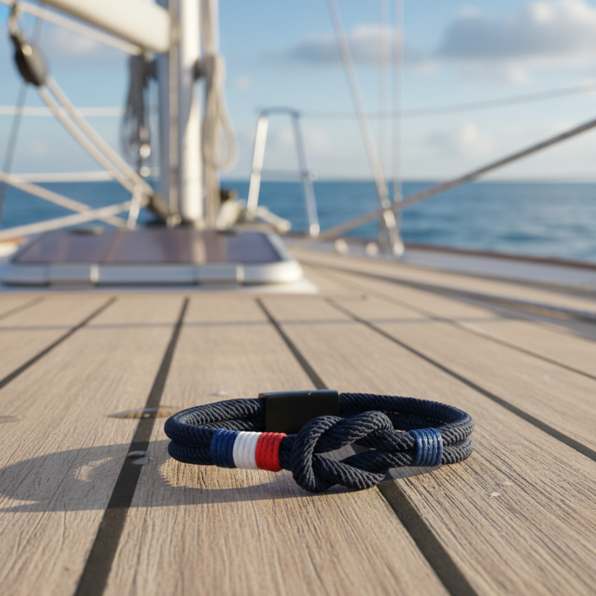 Découvrez le bracelet Marceau, un bijou tressé fait main en corde et acier inoxydable noir, sublimé par un détail aux couleurs du drapeau français. Son design à double rang et nœud carré lui confère un style moderne, sobre et symbolique.