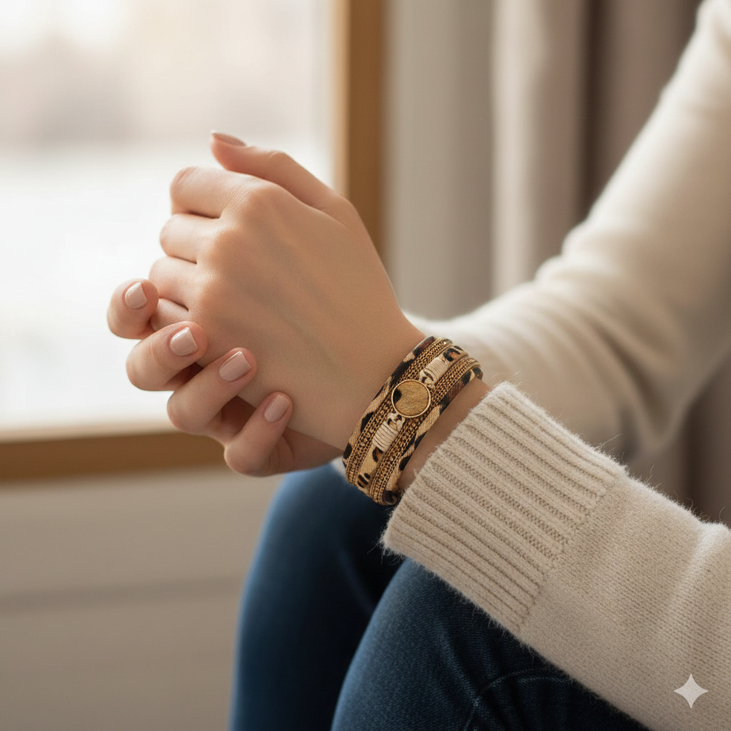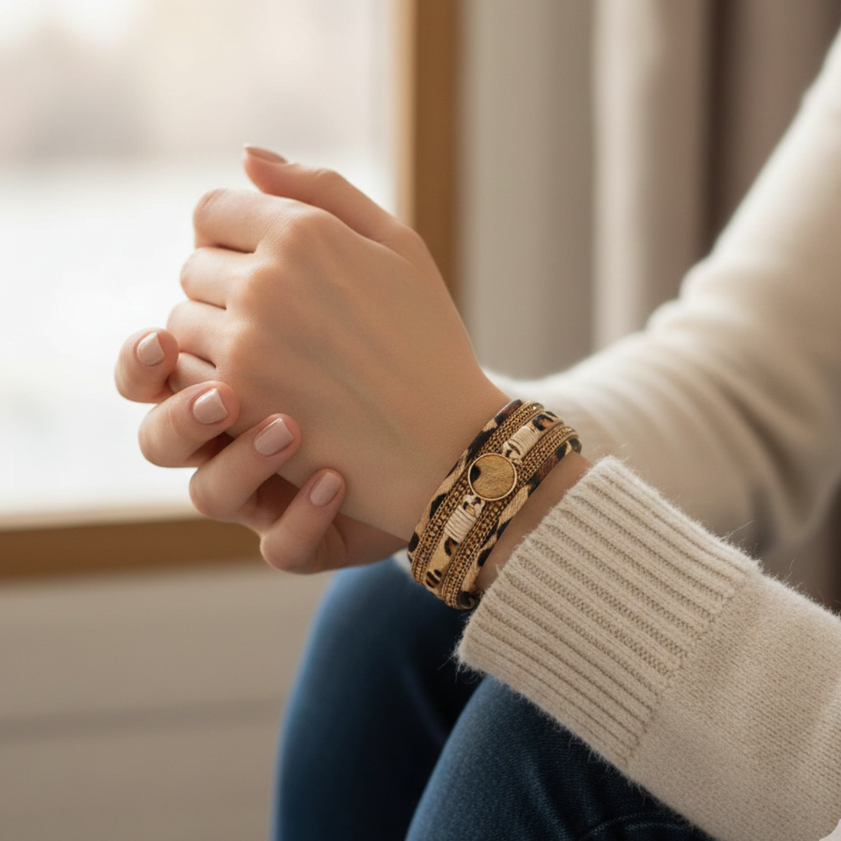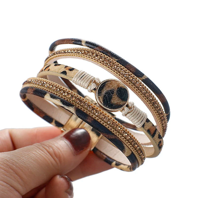 Découvrez le bracelet Naomi, un bijou bohème en cuir léopard au style vintage et multicouche. Son design associe des lanières souples à une chaîne en cristal scintillante, pour un rendu à la fois naturel et élégant.
