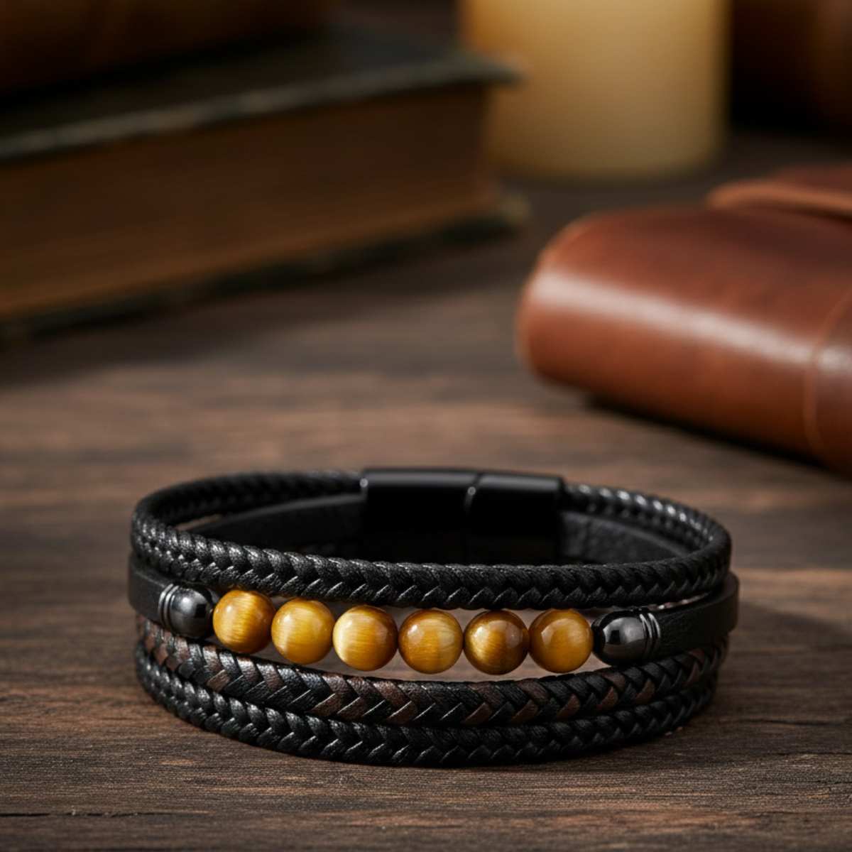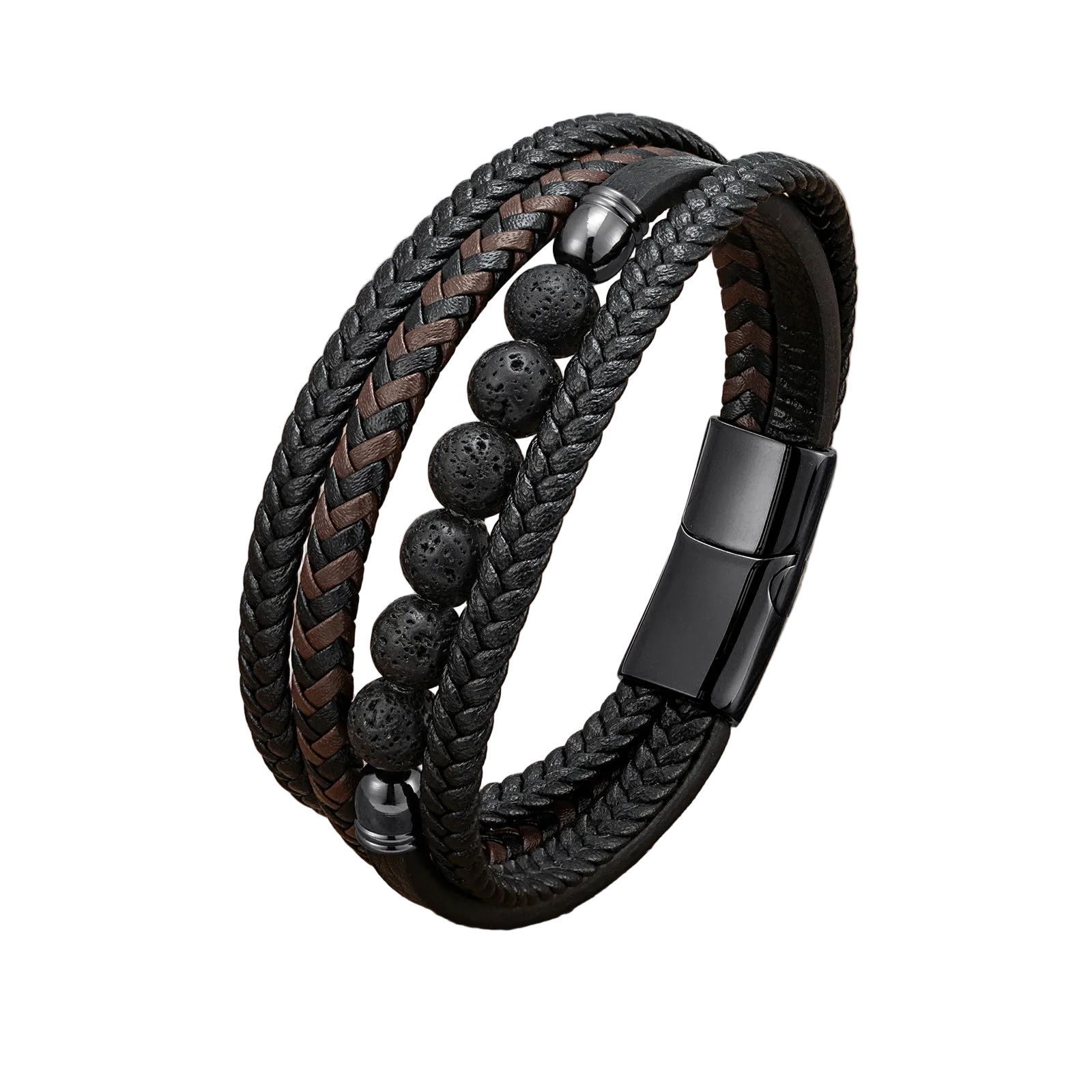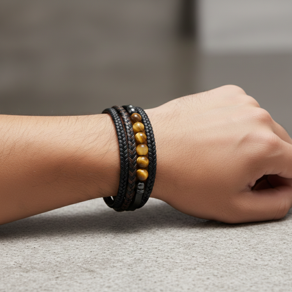Découvrez le bracelet Pierre, un bijou masculin associant pierres de lave naturelles, perles en œil de tigre et cuir tressé multicouche. Un mélange harmonieux entre style moderne et énergie minérale.